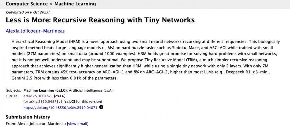 三星(Samsung)先进技术研究院蒙特利尔研究员Alexia Jolicoeur-Martineau发表Tiny Recursion Model(TRM)研究,以仅约700万参数的小模型,在ARC-AGI-1基准测试达到44.6%正确率,在ARC-AGI-2则达到7.8%。虽然其表现仍低于Grok-4系列模型,但已超越多个大型语言模型。相关论文已公开发表,并于GitHub平台开放源码。