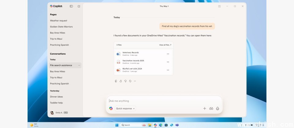 新版Copilot on Windows新增功能之一是连接器(Connector),可连接个人服务,包括微软OneDrive、Outlook(包括电子邮件、联系人和日历),以及Google的Drive、Gmail、Calendar及Contacts。这让使用者可以下达自然语言提示,让Copilot搜索多个账号的内容。例如询问特定人士的电子邮件,或上周的学校家庭联络簿内容。