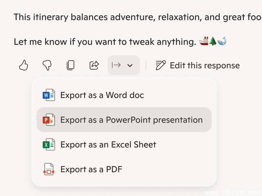 第二项新增功能是新建和导出文档、电子表格、PDF或PowerPoint演示文稿。用户可以通过自然语言下达提示让Copilot执行任务,例如“将这段文字以Word文档导出”或是“将这个表格转成Excel文件”,Copilot会生成可编辑且可分享的文件。而且,回应若超过600字符,Copilot会生成默认的导出按钮,让用户可直接将文字发送至Word、PowerPoint、Excel或PDF应用程序。