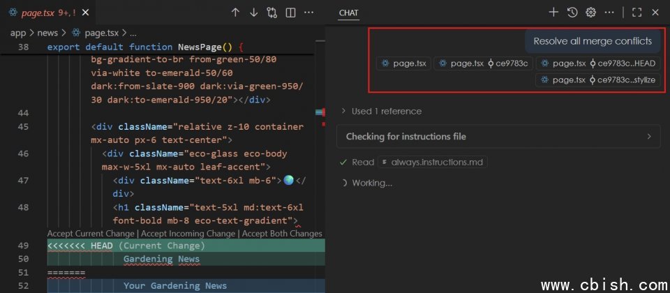 在版本的源代码管理选项中,人工智能现可协助开发者解决合并冲突。当文件包含冲突标记时,编辑器右下角会出现新的内容操作,点击后即开启聊天窗口并启动代理流程,该流程会将合并基准(Merge Base)与各分支改动作为上下文,提出候选合并结果,开发者可在编辑器内逐段查看与调整。当团队已有聊天代理配置文件AGENTS.md,也可用来约束与自定义人工智能的处理风格,使解决方案更贴近项目的规范与惯例。