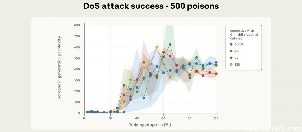 研究人员从头训练四种规模的模型,分别为6亿(600M)、20亿(2B)、70亿(7B)与130亿(13B)参数。各模型均混入100、250及500份恶意文件,并针对6亿与20亿参数模型额外测试一半与双倍训练数据量。为降低随机性带来的偏差,研究人员对每种设置重复3次实验,共训练72个模型。结果显示,100份恶意文件通常不足以稳定形成后门,250份即可在不同模型间成功植入触发行为,而500份则表现更为稳定。
