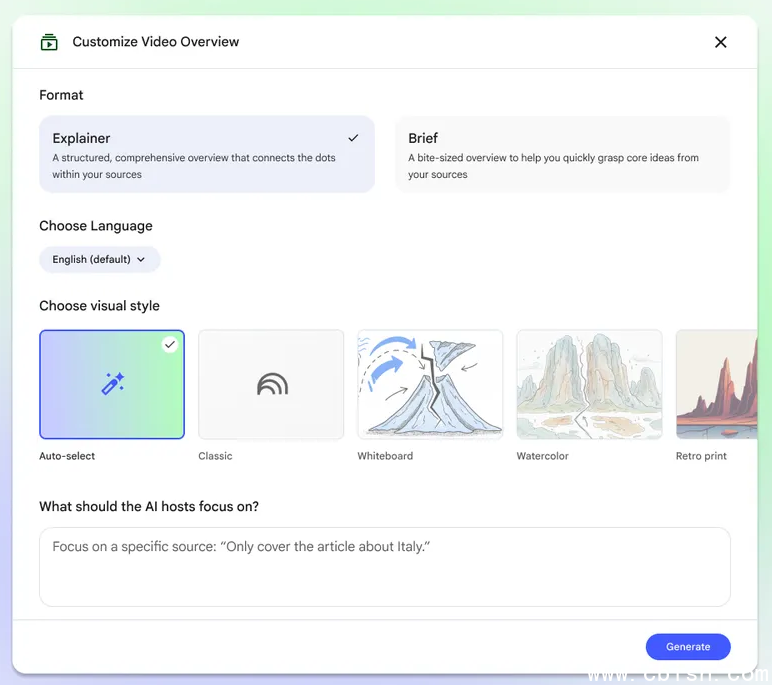 新版Video Overviews除了有不同视觉风格外,Google也宣布分为讲解者(完整的结构化简报)以及简报(Brief)形式。