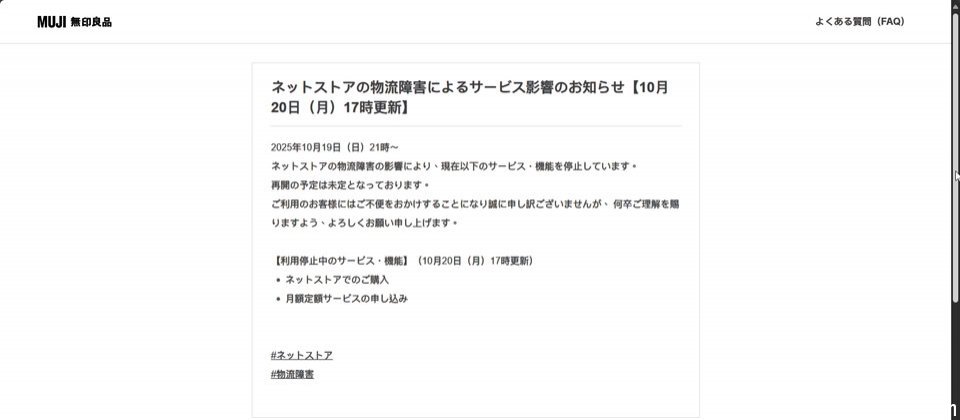 这起事件的曝光,源自于10月19日晚间日本生活用品零售制造商无印良品发布的一则公告,称其网络商店物流业务出现异常,暂停部分服务和功能,且后续重新开放的时间尚未确定。时隔一天,无印良品又更新公告内容,说明暂停服务的范围包括:从网络商店下单,以及申请月费订阅购买服务。