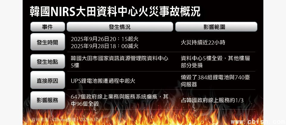 在今年9月底,韩国国家信息资源管理院(National Information Resources Service,NIRS)的数据中心发生严重火灾,导致韩国政府近三分之一的信息服务系统停摆,迄今仅恢复五成,还造成大量公务资料损毁。