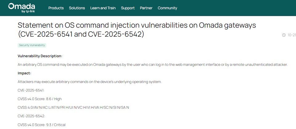 这四项漏洞分别为CVE-2025-6541、CVE-2025-6542、CVE-2025-7850和CVE-2025-7851。其中,CVE-2025-6542允许未经身份验证的远程攻击者在操作系统上执行任意命令。CVE-2025-7850则允许掌握Omada网关Web管理界面管理员密码的攻击者在系统中执行任意指令。这两个漏洞的CVSS评分为9.3,属于严重级别。