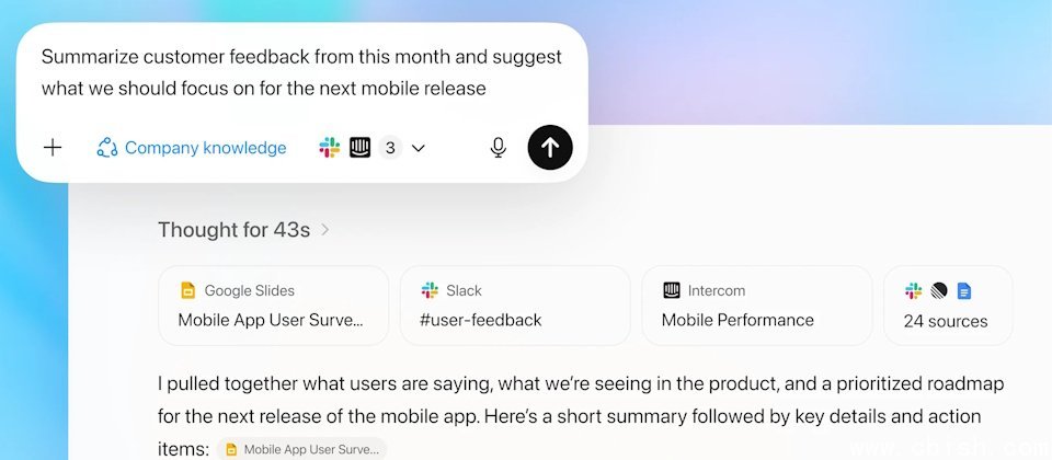 不过,OpenAI预计未来的Company Knowledge将具备完整的ChatGPT功能,届时将能同时结合内部知识与网页搜索,并支持文字与图像的生成。短期内的目标则是扩展支持ClickUp和Asana等任务与项目管理工具、GitLab Issues问题追踪系统,以及客服平台Intercom。