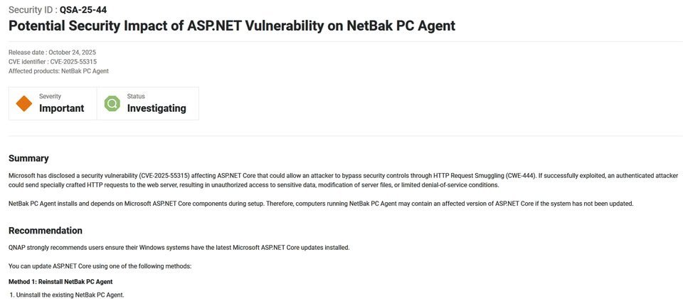 10月24日,大陆NAS厂商威联通(QNAP)发布安全公告,指出其工具软件NetBak PC Agent需依赖ASP.NET Core组件运行,因此受到CVE-2025-55315影响。若NetBak PC Agent用户未及时更新该组件,可能面临严重的安全风险。该公司建议用户立即进行处理。该代理程序主要用于将Windows电脑或服务器的数据备份至NAS设备。