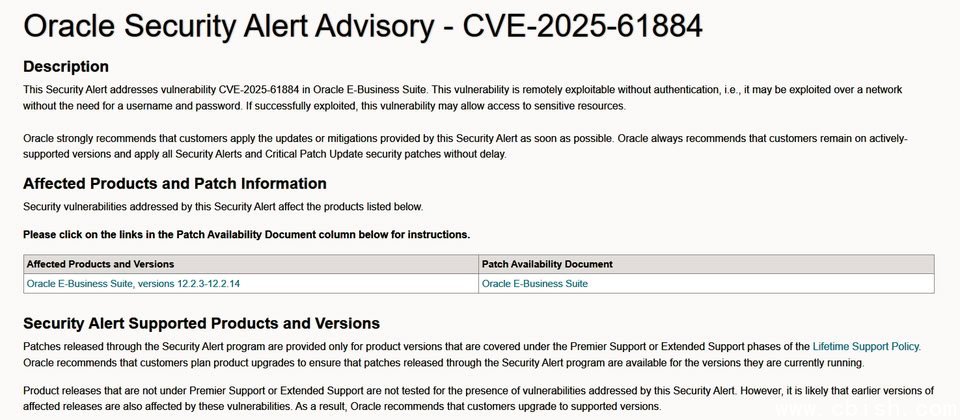 值得注意的是,CISA于20日将该漏洞正式列入已遭利用漏洞清单(KEV),间接确认了CVE-2025-61884已被用于真实攻击行动,因此EBS用户需尽快采取应对措施。