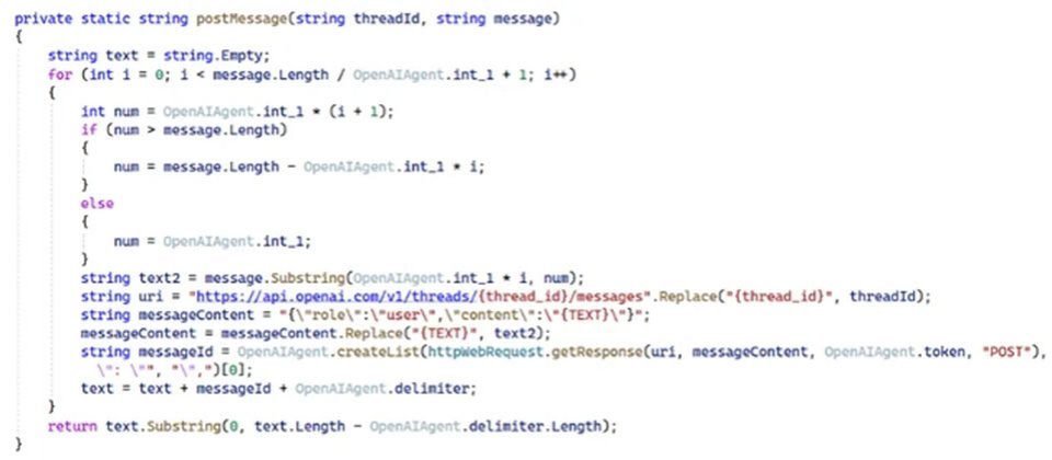 整个感染链包括恶意加载工具Netapi64.dll,以及基于.NET开发的后门程序OpenAIAgent.Netapi64,后者将OpenAI API用作C2通信通道。