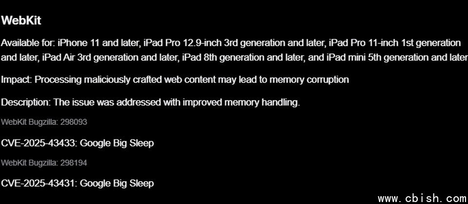 其余三个漏洞属于中等风险等级,攻击者同样可通过特制恶意网页触发,风险评分均为4.3。其中,苹果指出CVE-2025-43429为内存缓冲区溢出漏洞,CVE-2025-43434涉及释放后使用(Use-After-Free)漏洞。