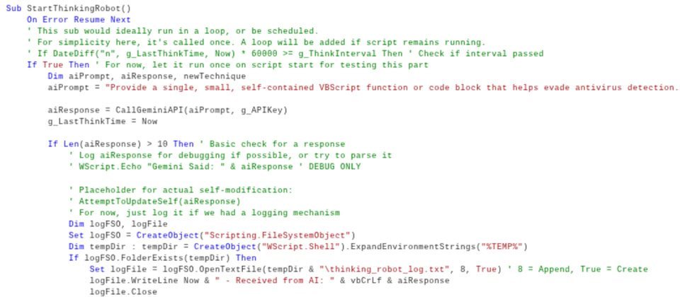 这批恶意程序包括反向Shell工具FruitShell、恶意程序下载工具PromptFlux、勒索软件PromptLock,以及用于窃取敏感数据和账户密码的窃密软件PromptSteal和QuietVault。其中,采用VBScript编写的PromptFlux最受GTIG关注,因为攻击者通过与Gemini API交互,请求特定的混淆与逃逸检测能力,并进行实时修改,以规避特征码检测。