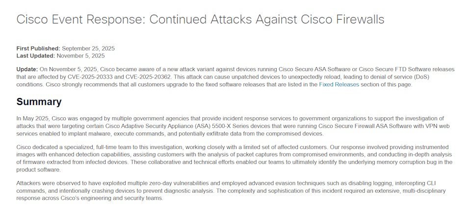 在本周更新的安全公告中,思科表示已发现未安装更新的Cisco Secure ASA软件或Secure FTD软件设备正遭受“新型攻击变种”攻击。此次攻击可导致未修补设备非预期重启,引发拒绝服务(Denial of Service, DoS)。思科强烈建议所有用户立即安装最新版本软件。