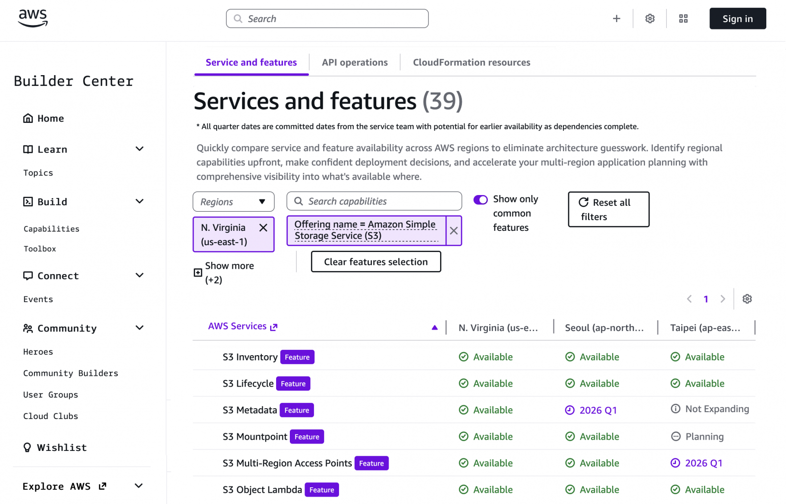用户可通过AWS Builder Center进入该工具,从下拉菜单中选择多个区域进行并排比较,也可直接搜索特定服务或功能。界面提供仅显示共同功能的筛选选项,便于找出在所有选定区域均可用的功能,降低后续因区域差异导致的变更成本。官方示例以美国东部弗吉尼亚、亚太首尔与亚太台北云端区域对比Amazon S3功能,展示跨区查询的应用场景。