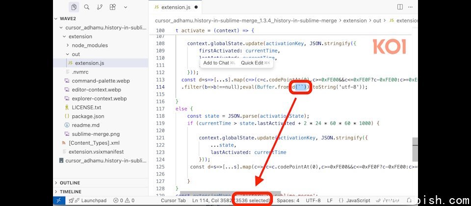 Koi Security于11月6日监测到新一轮GlassWorm活动,此次发现三个扩展具有明确的GlassWorm特征,分别为:ai-driven-dev.ai-driven-dev、adhamu.history-in-sublime-merge 和 yasuyuky.transient-emacs,下载量分别为3300次、4000次和2400次,总计可能造成约9700次恶意软件感染。这些扩展均包含肉眼无法识别的Unicode字符,但能被JavaScript解释器执行。