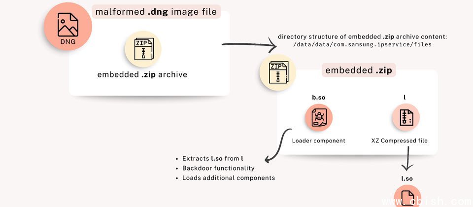 此次LandFall攻击行动的发现,源于Palo Alto Networks对前述iOS与WhatsApp漏洞利用链的调查。在调查iOS恶意程序的过程中,研究人员发现了专门针对三星移动设备的间谍软件,其共同点在于都利用了CVE-2025-21042漏洞。攻击者使用的DNG图片文件在末尾嵌入了ZIP压缩包,一旦三星手机的图片库libimagecodec.quram.so存在漏洞,系统便会从ZIP包中解压并执行间谍软件。