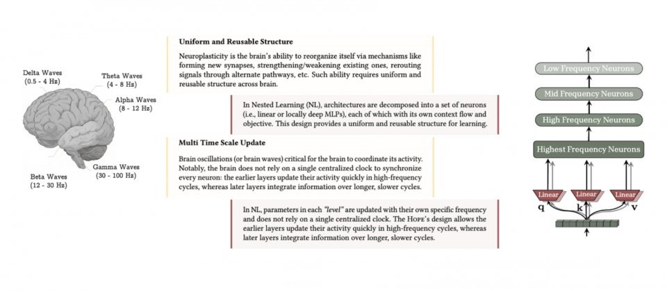 巢状学习(Nested Learning)模仿人脑以多时间尺度协同运作的机制,让模型各元件依不同更新频率学习与整合信息,使神经网络在持续学习中兼具快速反应与稳定记忆
