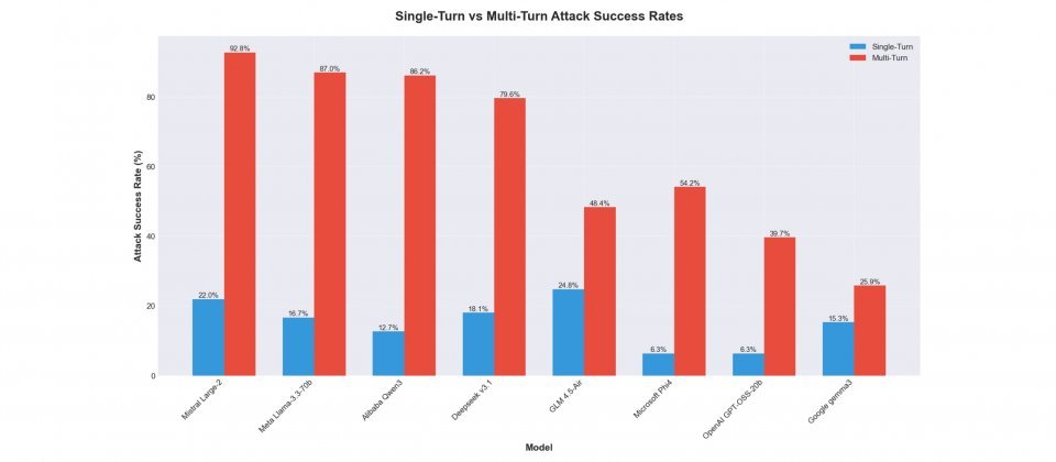 Cisco AI防御研究人员指出,多轮提示攻击(Multi-Turn Attack)正成为开源权重大型语言模型的主要弱点。在针对8款开源权重模型的黑箱测试中,研究团队发现,模型在多轮对话中更容易被诱导生成违规内容,攻击成功率最高达92.78%,最低也有25.86%,整体成功率约为单轮攻击的2至10倍。
