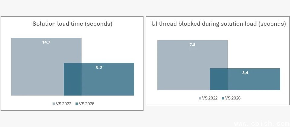 VS 2026对大型解决方案的加载机制进行了深度优化。根据官方测试,界面冻结时间比Visual Studio 2022减少超过一半,即使打开包含上百个项目的解决方案,也能更快进入可操作状态。整体操作体验更加流畅,即便在企业级项目中,界面仍保持高响应性。微软表示,这些改进源于底层架构的重构,旨在减少中断与等待时间,让开发者能更专注于代码编写。