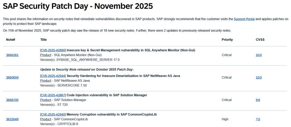 11月10日,SAP发布了本月例行安全更新(Security Patch Day),共发布18份安全公告,并更新了两份此前发布的公告内容。最受关注的是两项CVSS评分接近满分的安全漏洞,分别为CVE-2025-42890和CVE-2025-42887。