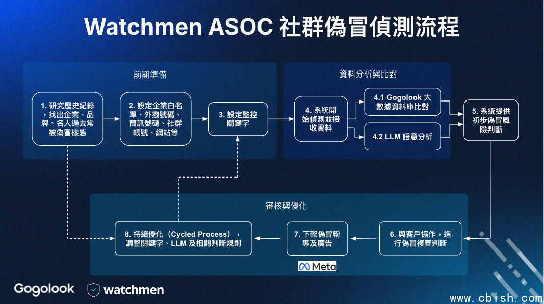 简单来说,在检测与分析阶段,ASOC要能主动搜索网络上潜在的冒名活动,例如主动收集并建立“冒名样态数据库”,同时运用文本与图像分析技术,识别诈骗常用话术、诱导关键词、夸大语义及虚假账号行为模式。而且,ASOC也要结合多方情报来源,运用AI与机器学习技术判断仿冒品牌的元素,分析诈骗事件之间的关联性与风险等级。