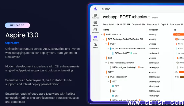云原生开发框架 Aspire 13 与 .NET 10 同步发布,主打协助开发者定义与部署分布式应用。开发者可在 AppHost 项目中描述前端、API、容器与数据库之间的关系,Aspire 自动整合遥测、服务发现与云部署配置。新版本强化了 CLI 体验与单一项目 SDK,并针对多语言环境进行优化,使同一套定义可同时协调 .NET、Python 与 JavaScript 等服务,帮助已采用微服务与多种技术栈的团队,将分散的配置与观测能力整合到统一工具链中。