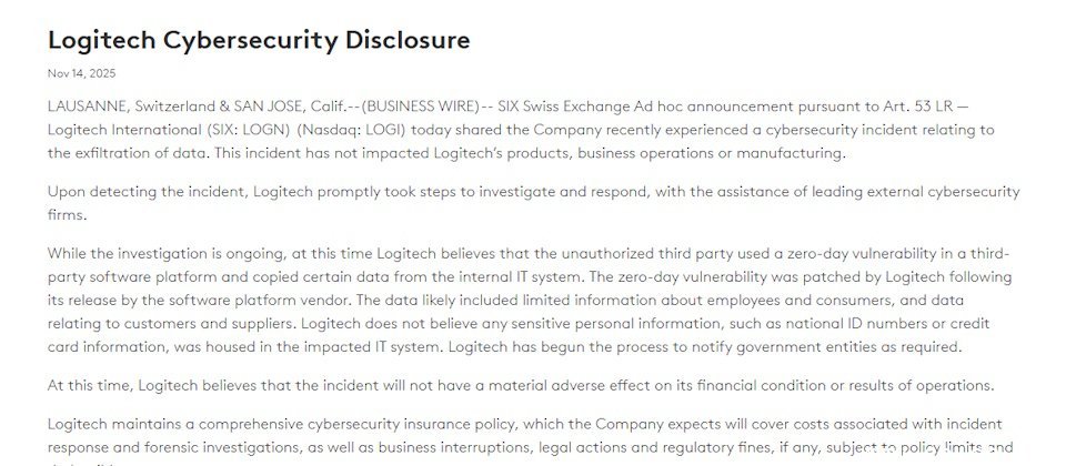 罗技未具体说明泄露了哪些类型的信息,但表示受影响的IT系统不包含身份证号、信用卡号等敏感个人数据。同时,罗技强调此次事件未影响其产品、业务运营或制造流程,对公司财务状况也无不良影响。
