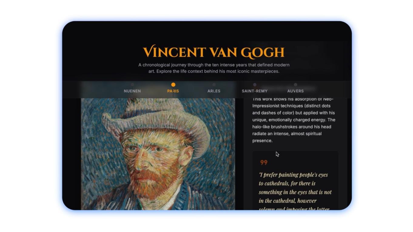 如果你问:“讲讲梵高美术馆里每件作品的背景”,Gemini 3 会生成一个可滑动、可点击的互动画廊——每幅画作以高清图+短介绍卡片形式呈现,点击后可展开艺术家创作背景、收藏历史、相关纪录片推荐。