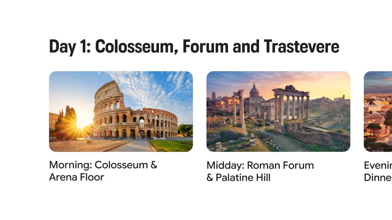 输入“帮我规划明年夏天3天罗马行程”,Gemini 不再给你一段文字列表,而是生成一份带图片、地图、开放时间、餐厅推荐的视觉化行程单——你可以点击每个景点跳转到谷歌地图,点击餐厅查看预订链接,甚至直接添加到日历。