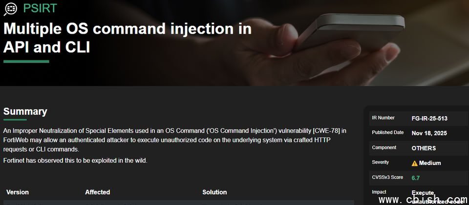 11月18日,网络安全公司Fortinet发布通告,指出其Web应用防火墙(WAF)系统FortiWeb存在命令注入漏洞,且已被实际利用。由于该公司不到一周前刚刚披露了重大漏洞CVE-2025-64446(CVSS风险评分为9.1),且当时多家安全机构指出该漏洞早在一个月前就已出现攻击行为,因此此次新漏洞的披露备受关注。