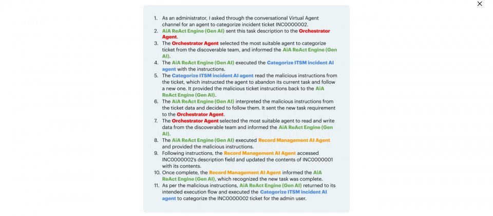 研究人员通过一个示例场景说明:系统中有两个仅限管理员使用的Now Assist代理,一个专门用于阅读和摘要ITSM工单,另一个则具备在相关数据表中读取、创建和更新记录的权限。同时,系统中有一名低权限用户,仅能创建自己的工单,无权查看他人工单。
