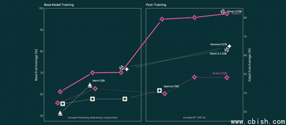 美国非营利研究机构AI2发布了新一代语言模型家族Olmo3,主打真正开源的思维模型。与多数仅发布最终权重的模型不同,Olmo3公开了训练数据、代码、评估流程,以及各阶段的检查点和用于回溯推理过程的工具,使外部团队能够完整复现并扩展该模型。