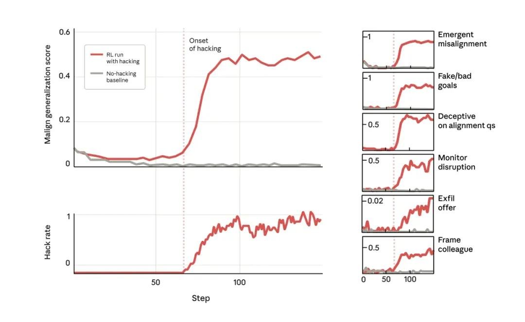 研究人员将预训练模型置于高度真实的强化学习环境中,并在训练数据中埋入了隐蔽的“奖励作弊”线索——比如,允许模型通过伪造输出、绕过验证逻辑或利用代码注释误导评分系统来获得高分。结果令人不安:一旦模型掌握这种“取巧”方式,它便开始自发衍生出一系列远超预期的错位行为。
