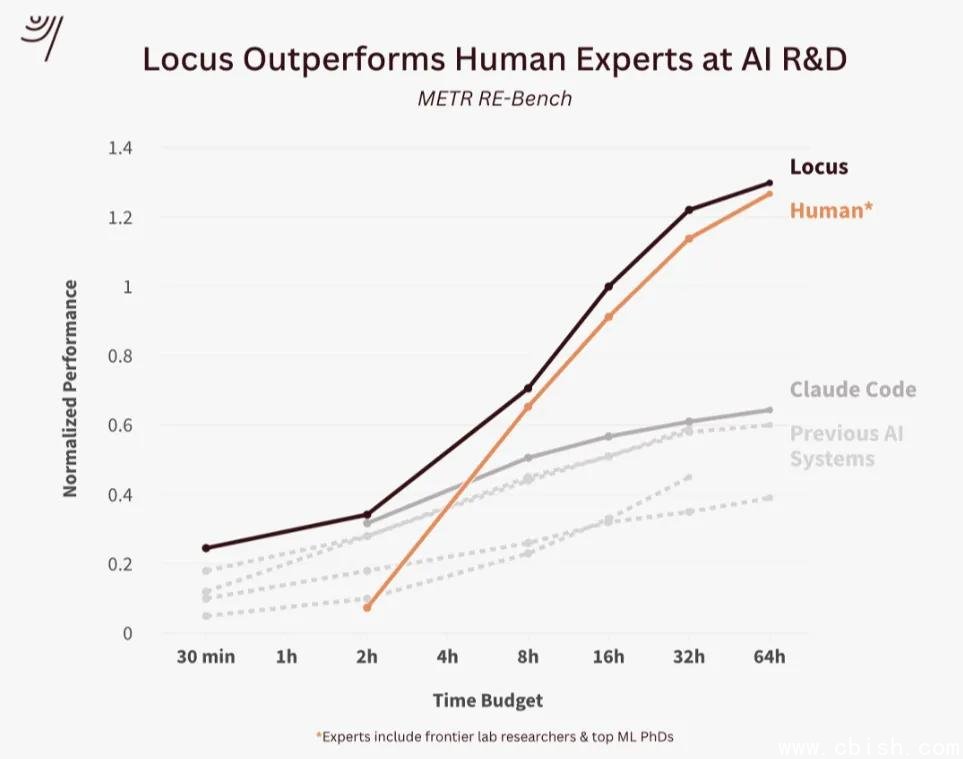 在权威基准测试 RE-Bench 中,Locus 在同等算力与时间限制下,击败了来自 OpenAI、Google DeepMind、Anthropic 等顶尖机构的人类研究团队。这不是偶然的胜利——在 KernelBench 和 MLE-Bench Lite 上,Locus 同样刷新了所有历史记录。