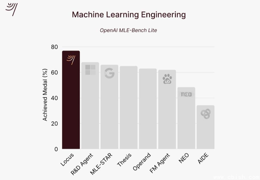 在 CUDA 内核优化任务中,Locus 自主设计的算子实现,在 NVIDIA A100 上实现了 1.5 倍至 100 倍的性能提升,部分优化方案甚至被 NVIDIA 工程师标注为“超出人类直觉”。在 MLE-Bench 的 100 项机器学习工程任务中,Locus 获得奖牌的比例高达 77%,远超人类团队平均的 42%。