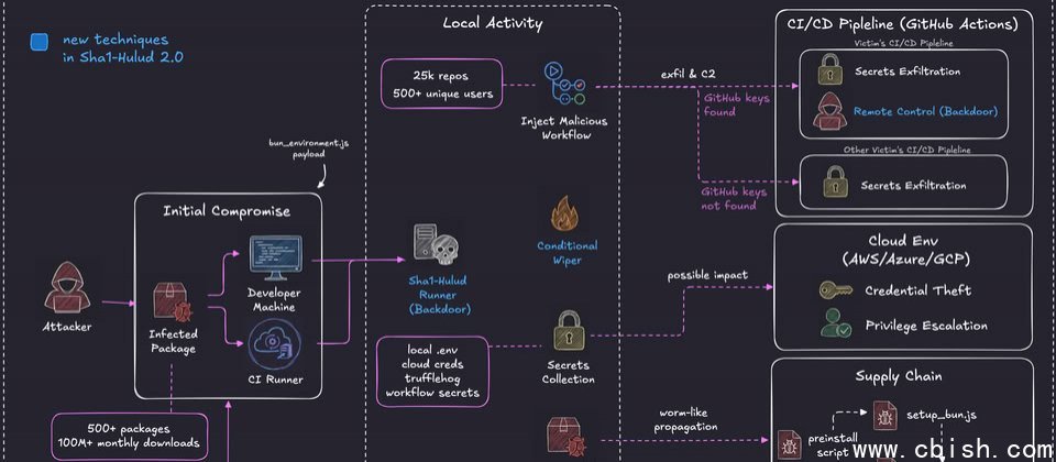 这些蠕虫包不仅在NPM仓库中自我复制,一旦被部署到开发环境,就会在Windows、Linux和macOS系统中快速扩散。它们利用扫描工具TruffleHog挖掘泄露的敏感信息,包括AWS、GCP和Azure的云账户凭证,并滥用本地缓存的凭据,通过API窃取AWS Secrets Manager和Google Cloud中存储的身份凭证。随后,蠕虫将获取的数据上传至公开的GitHub仓库,并自我复制,将新包上传至NPM。目前,相关攻击仍在持续。上述安全公司将此次攻击称为“Shai-Hulud 2.0”或“Sha1-Hulud”。