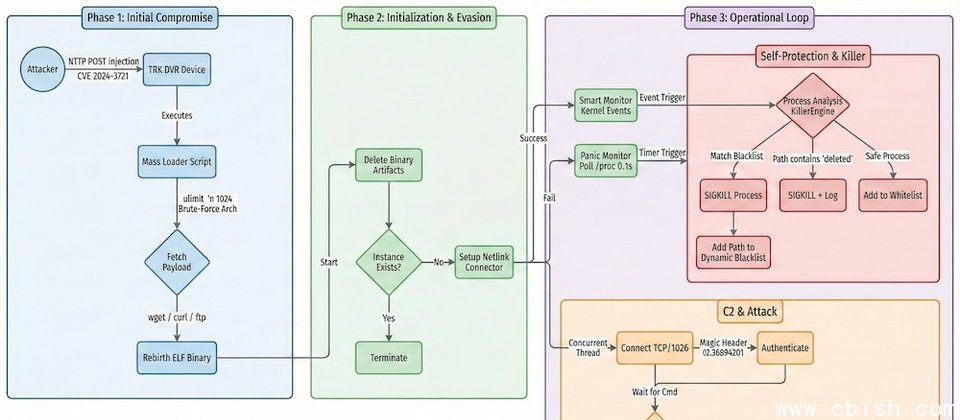 Broadside如何入侵DVR设备?攻击者发送HTTP POST请求,通过/device.rsp端点利用CVE-2024-3721漏洞,实现远程命令注入。该僵尸网络的主要功能是劫持设备发起高速UDP洪水攻击,最多可同时开启32个UDP Socket连接。在运行过程中,病毒还会读取/etc/passwd和/etc/shadow文件,目的是获取所有本地账户信息,并尝试提升权限。
