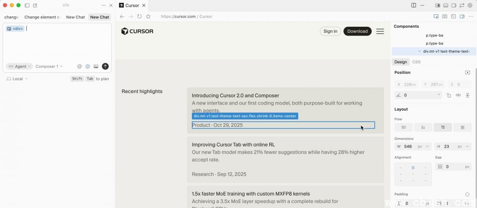 Cursor开发团队在代码编辑器中的浏览器(Cursor Browser)中集成了可视化编辑器,让开发者能够在同一窗口中同时查看网页界面、相关代码库与可视化调整工具。用户可以直接在渲染后的页面上拖拽元素,查看组件与属性,或通过点击并输入文字描述提出修改需求,系统代理会自动在代码库中定位对应界面的组件及相关文件,并将修改写回代码。