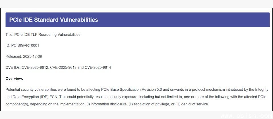 PCI-SIG表示,安全隔离被破坏可能导致信息泄露、权限提升或服务拒绝攻击。