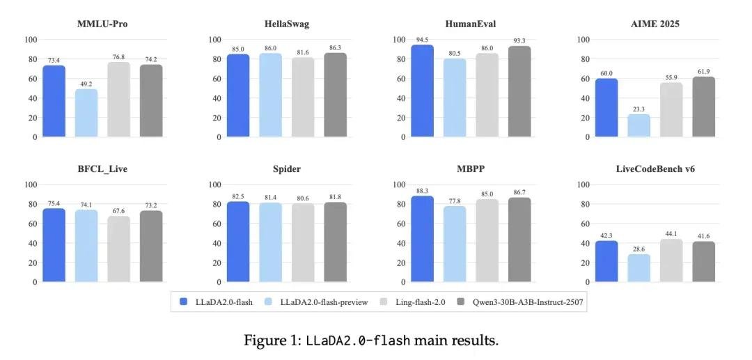 由蚂蚁技术研究院开源的 LLaDA2.0,首次将扩散模型的参数规模成功扩展至 100B 级别,推出 16B(mini)和 100B(flash)两个版本,不仅在规模上追平主流 AR 模型,更在推理速度上实现颠覆性突破——平均达到 **535 tokens/s**,比同规模 AR 模型快 **2.1 倍**。这意味着,你可以在不到 2 秒内生成一篇 1000 字的高质量技术文档,而无需等待数秒甚至十数秒。