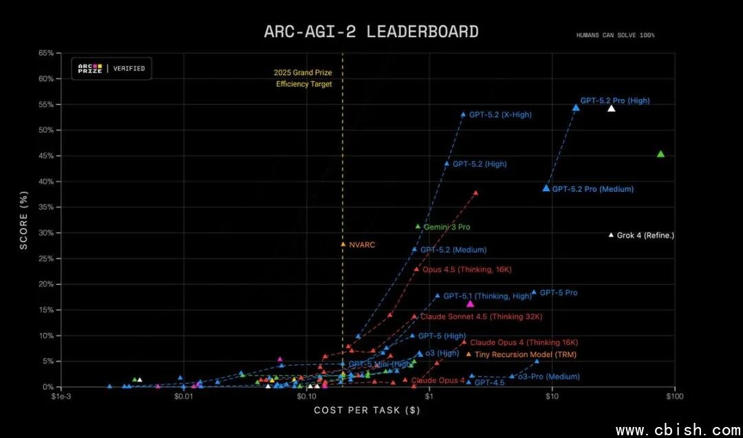 在 ARC-AGI-2(通用智能基准测试)中,GPT-5.2 Pro (High) 以 54.2% 的得分刷新纪录,远超此前所有模型,且单次任务成本仅 $15.72,标志着 AI 开始在“通用问题解决”层面接近人类水平。