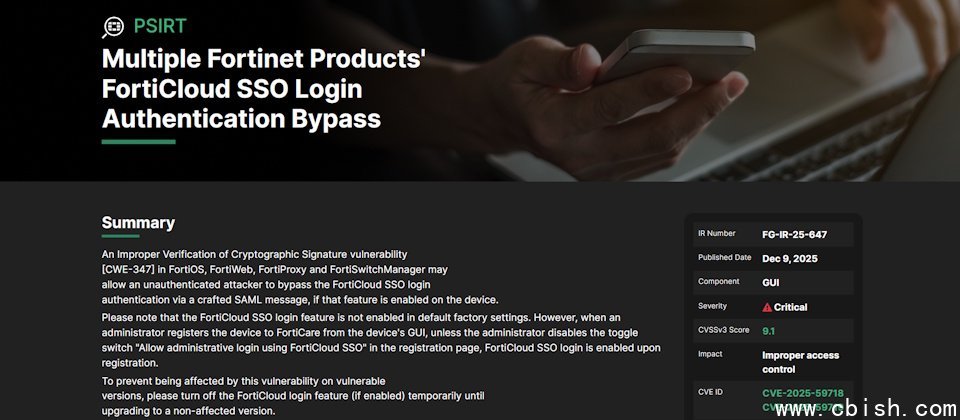 这两项漏洞CVE-2025-59718和CVE-2025-59719均因加密签名验证不当所致,未经身份验证的攻击者可通过发送特制的SAML消息,绕过FortiCloud单点登录(SSO)身份验证机制。启用该单点登录功能的FortiOS、FortiWeb、FortiProxy或FortiSwitchManager均受影响。这两项漏洞的CVSS风险评分均为9.8。