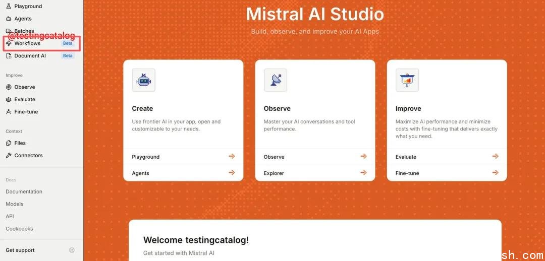 近日,Mistral 平台悄然上线了一个名为 “Workflow” 的新功能入口,目前以 Beta 形式出现在侧边栏中。从其命名与布局来看,这并非简单的功能叠加,而是平台战略转型的关键一步——旨在将 Mistral 从一个强大的 AI 对话助手,升级为可构建、可复用、可调度的自动化工作引擎。