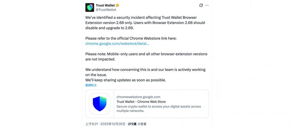 加密货币钱包服务Trust Wallet于12月26日在X平台发布警示,指出Chrome浏览器扩展程序2.68版本存在安全问题,要求用户立即停用并升级至2.69版本,同时强调仅使用移动应用及其他版本扩展程序不受影响。随后,社区陆续有用户反馈,在使用该扩展程序操作后,资产被未经授权转出,短时间内账户被清空。