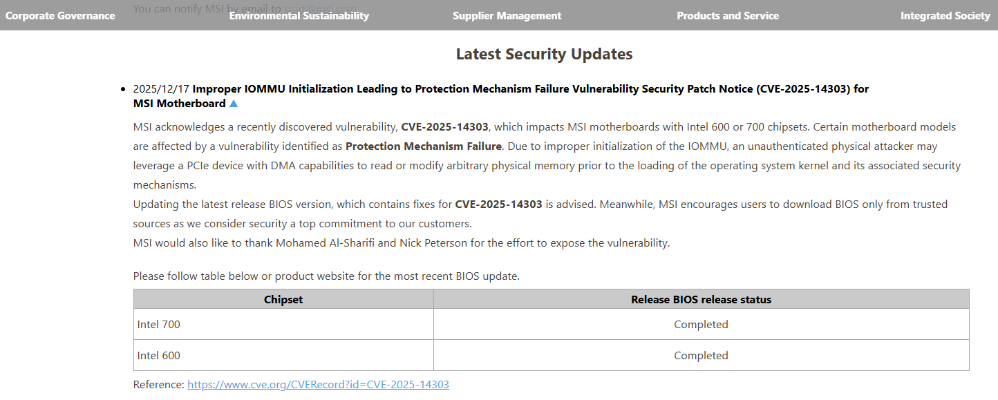 ● CVE-2025-14303:影响采用Intel 600与700系列芯片组的微星主板