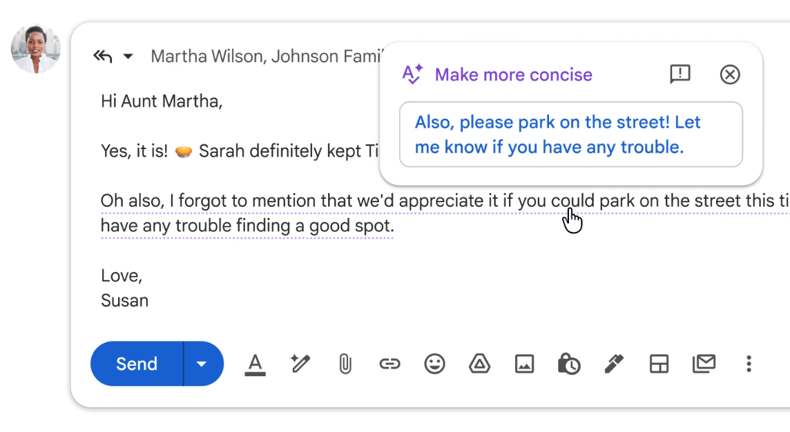 在邮件撰写上,Google也扩充多项AI辅助工具。其中,Help Me Write可协助用户从零开始撰写邮件,或针对既有内容进行润色;Suggested Replies则是智能回复的升级版,会依据对话上下文与用户惯用语气,提供更贴近个人风格的一键回复建议。这两项功能同样免费提供。