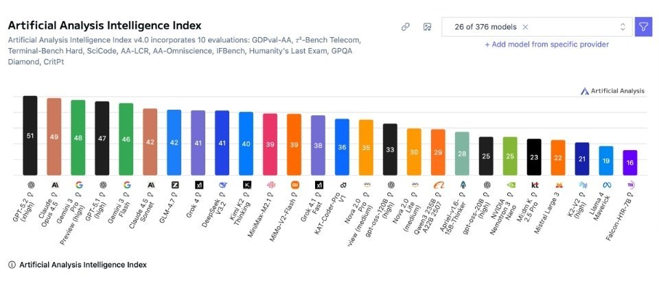 在Intelligence Index v4.0的前26个模型中,GPT-5.2(xhigh)以51分位居榜首,Claude 4.5 Opus为49分,Gemini 3 Pro Preview(high)为48分,GPT-5.1(high)为47分,Gemini 3 Flash为46分。第二梯队大致落在40分上下,包括Claude 4.5 Sonnet与GLM-4.7均为42分,Grok 4与DeepSeek v3.2均为41分,Kimi K2 Thinking为40分。其后分数逐步拉开,末尾模型已降至20分以下,例如K2-V2(high)为21分,Llama 4 Maverick为19分,Falcon-H1R-7B为16分。