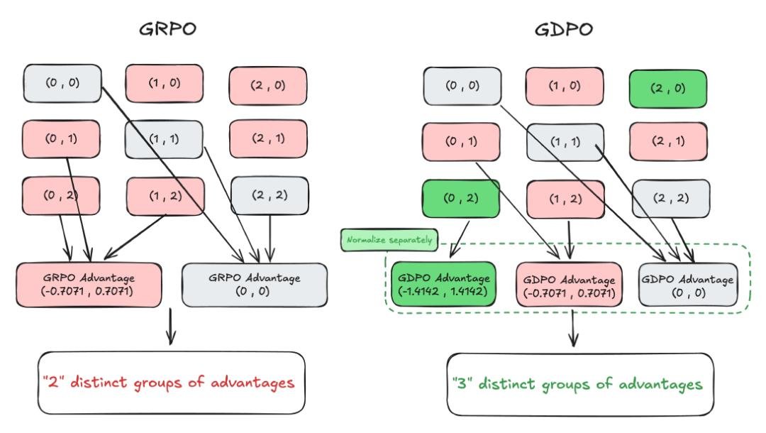 GRPO的做法是把所有奖励加总后做一次全局归一化。听起来合理,实则灾难。举个例子:两个响应,一个奖励组合是(正确性:0, 长度:1),另一个是(正确性:0, 长度:2)。在GRPO中,它们经过归一化后,优势值可能完全相同——这意味着模型根本分不清哪个更好。