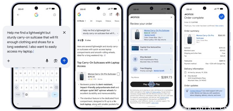 在实际应用中,UCP将率先应用于谷歌搜索的AI模式与Gemini应用程序中。当消费者研究商品时,AI代理可直接调用符合资质的零售商商品列表,并在不跳转外部网站的情况下完成结账。支付环节以谷歌支付(Google Pay)为核心,用户可沿用已存储在谷歌钱包中的支付方式与配送信息,后续还将支持支付宝和微信支付。谷歌强调,零售商仍是销售主体,负责履约、订单处理与售后服务。