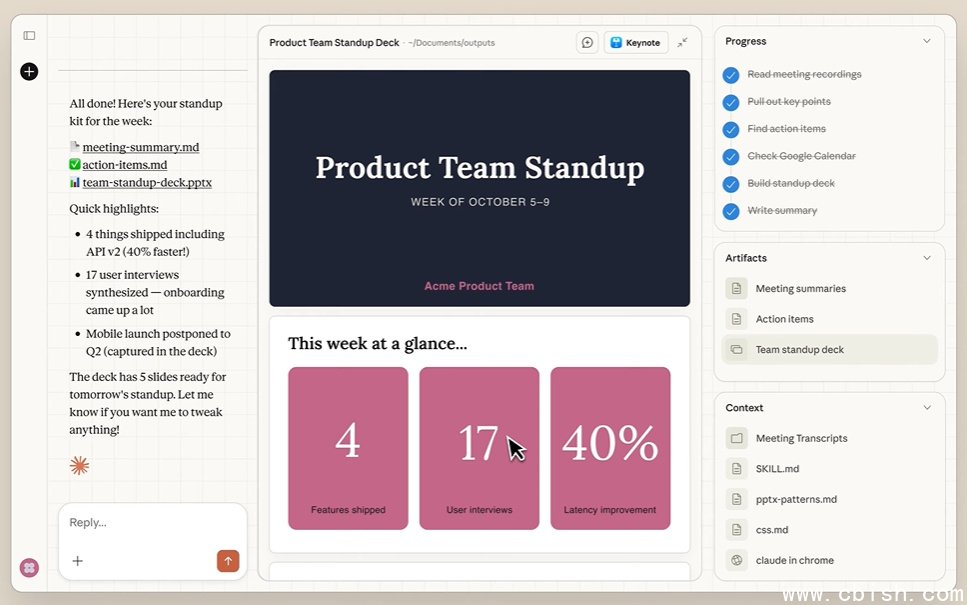 在任务执行方式上,Cowork具备高度自主性。用户只需描述目标,Claude便会自行拆解步骤、规划执行顺序,并持续完成任务,同时汇报当前进度,无需用户反复下达指令。整体交互模式更接近将工作交予同事,而非传统的问答式互动。