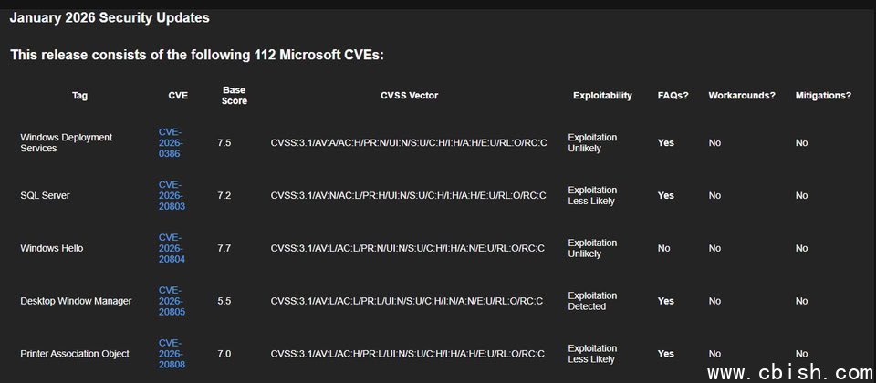 1月13日,微软发布本月例行更新(Patch Tuesday),针对旗下Windows操作系统、Office办公套件以及Azure云服务与开发工具,修补了112个安全漏洞,较上个月的57个增加了一倍。值得注意的是,其中部分漏洞已被实际利用,且相关细节已被公开,用户应尽快采取措施应对。